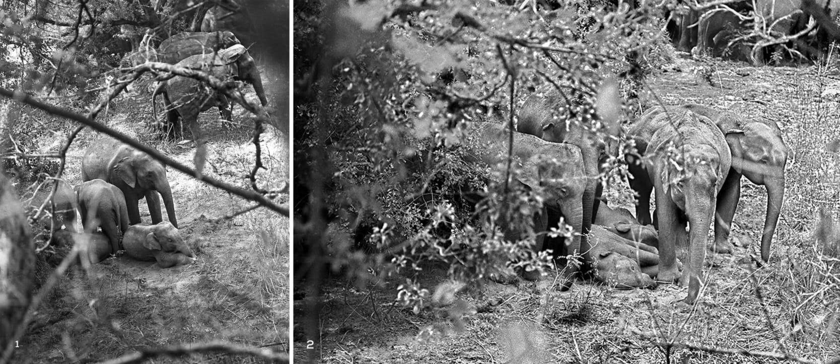 At times, we encountered elephants dozing during the scorching daytime hours, but capturing clear photographs proved challenging due to the dense foliage. Tracking a herd through thick jungles to their resting place presented us with risks and difficulties. Over the years, we followed various herds to resting places. It involved long treks on foot; occasionally, we crawled through bushes. We had to remain vigilant for snakes and scorpions on the forest floor. To prevent the elephants from detecting our scent, we always worked against the wind and remained prepared to retreat quickly to safety with our tripods and cameras.