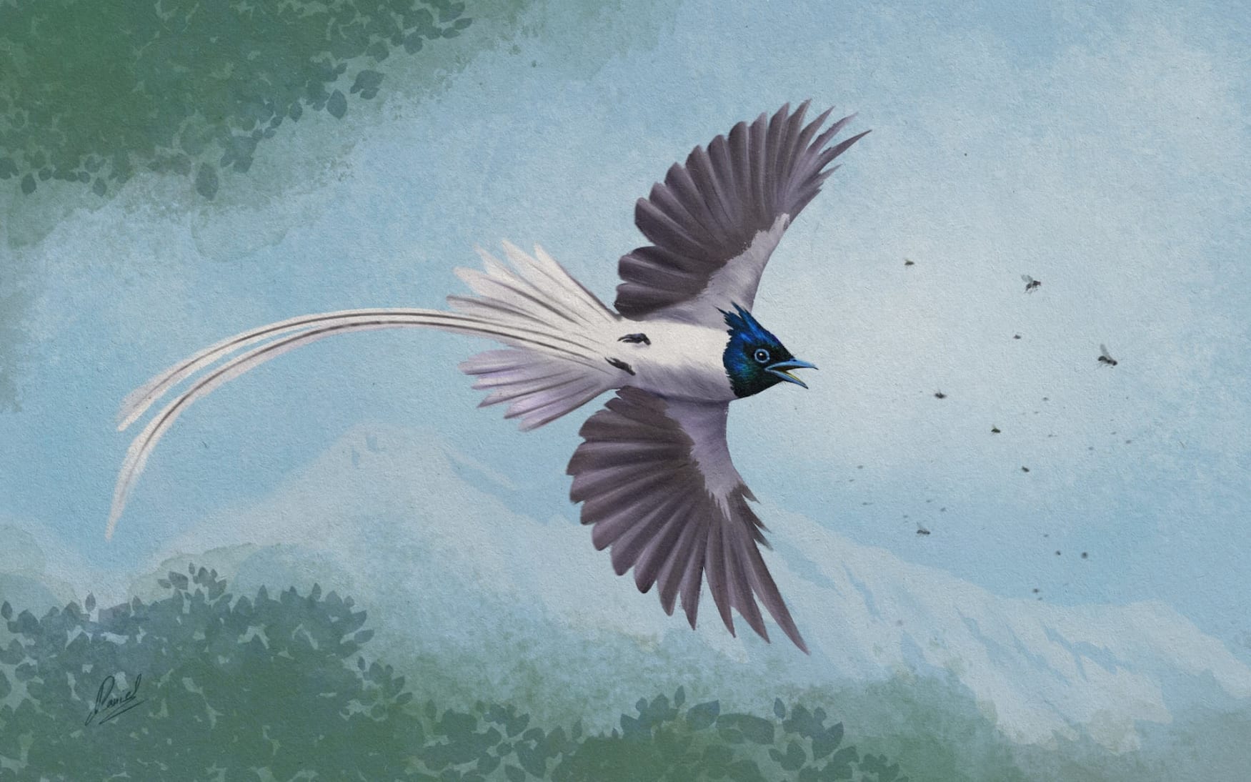 Surely not! How could it be paradise if it were buzzing with flies? So whoever gave the glitzy paradise flycatcher its name must have been smoking something strong! The bird is a dazzler: gents over four years, clad in silken white and ash grey, flaunting 18-inch-long tail ribbons, their heads and crests a glossy inky blue-black, their eyes neon-ringed. So yes, they would fit well in paradise. Unfortunately, they happen to also belong to the huge flycatcher clan — and alas, they do catch flies.
