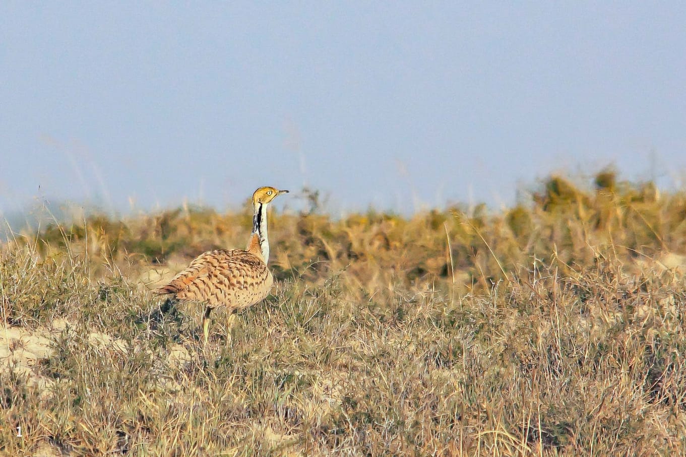 Reaching the Naliya grassland early the next morning, we saw the GIB male was indeed near the high mound, ready for its famous courtship display. His gular pouch wobbled like a pendulum and hung close to the ground, like a naulakha haar (valuable necklace). Not wanting to play a spoilsport in this matchmaking, we backed off, wishing Abdul luck in making more bustards.