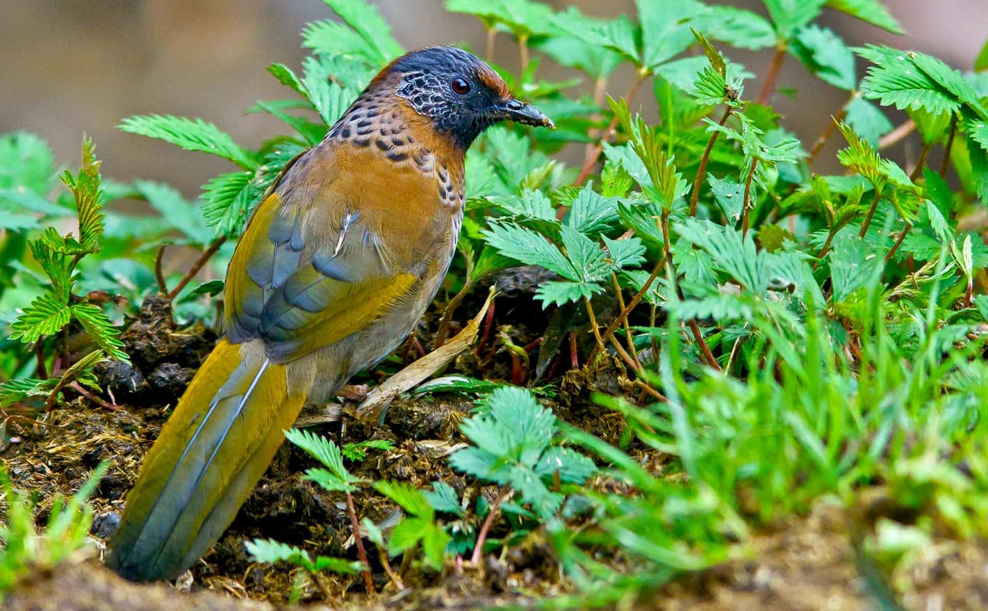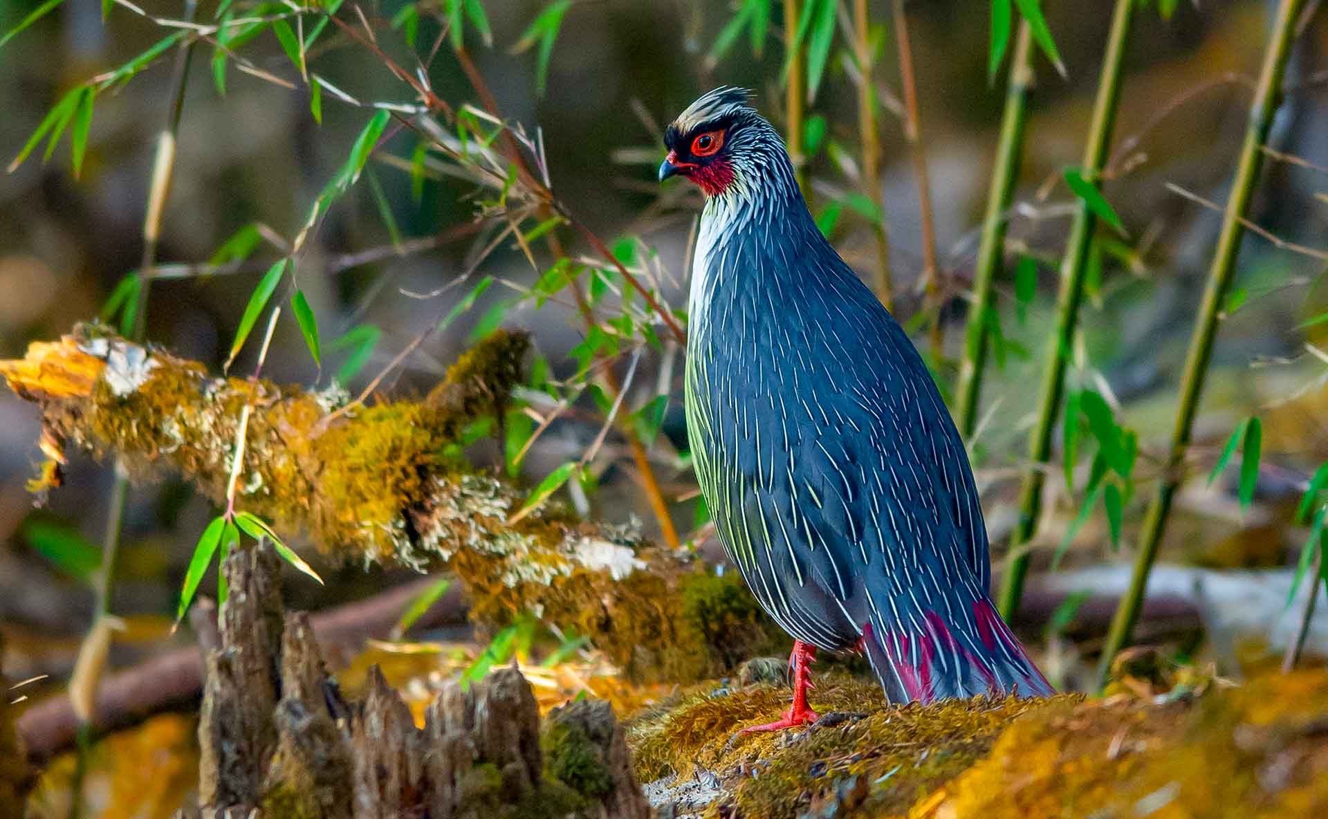 A red-faced, indigo-blue kalij pheasant (Lophura leucomelanos) swiftly crossed the road. I could hear the sound of its footsteps on the leaf litter as it descended the valley. The wails of a satyr tragopan (Tragopan satyra) echoed across the valley shortly afterwards.