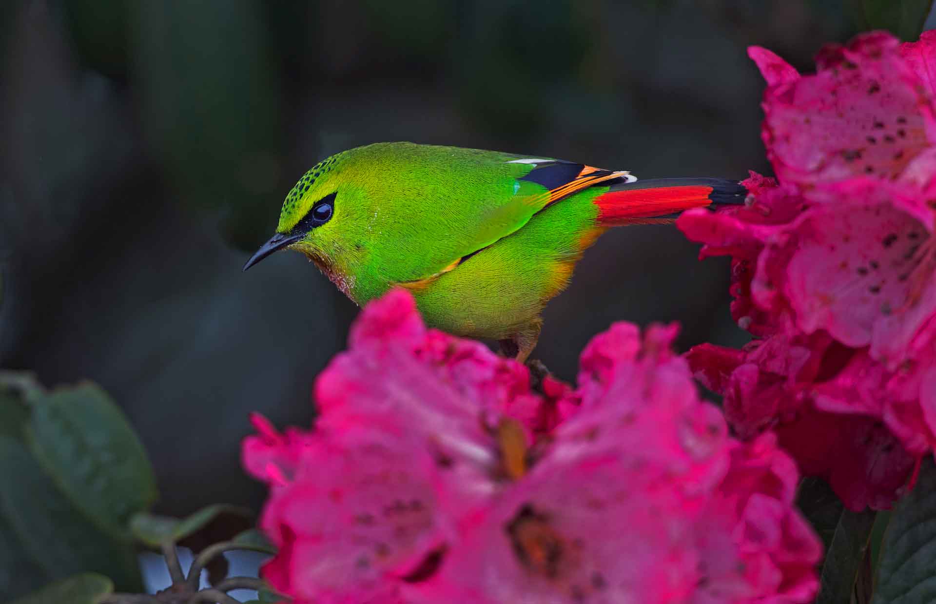 A fire-tailed sunbird (Aethopyga ignicauda), with an even redder tail, appeared moments later as if to compete with the sheer intensity of the rhododendron. Sunlight bounced off the red on its back and the yellow on its breast as it flitted about the branches searching for nectar.