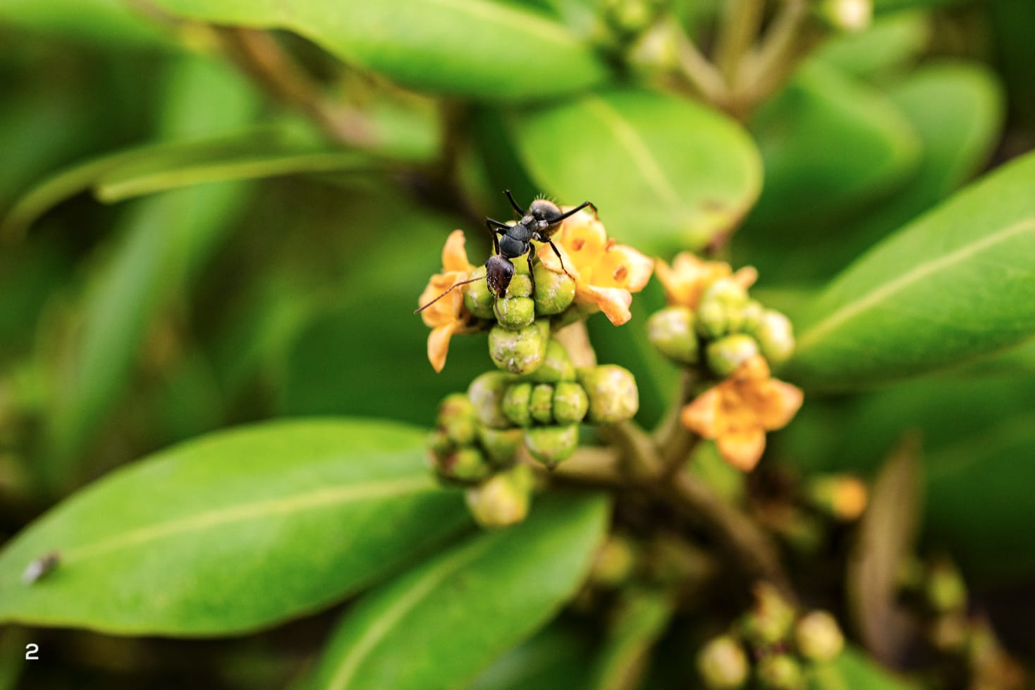 As I stomped through the marshes each day, the heady smell of hydrogen sulphide that my feet unlocked from the soil featured as a fleeting whiff in the strong shoreside winds. How do tiny insects contend with winds that steadily blow at 25-40 knots? When I walked right up to the thick and bushy Avicennia, the speed of the wind was broken by clusters of branches and leaves. They were softening the force of the wind — not unlike the role played by collectives of mangroves absorbing the force of surging coastal waves. The slow-moving breeze around the Avicennia was filled with the fragrance of its small yellow flowers that had attracted a smorgasbord of small insects. The air was busy with bees and flies moving between flowers, drinking nectar and delivering pollen from one flower to another. In addition to the flying insects, trails of ants also came to the flowers for nectar. The ants that came to these mangrove trees would need to wait until low tide to cross back to their colonies in the ground several metres away. On the network of branches, jumping spiders moved stealthily until they were within reach of a bee or fly engrossed in a sugary drink. Deeper within the network, I saw glimpses of three-dimensional webs built by comb-footed spiders that had caught ants that may have fallen from a branch above.