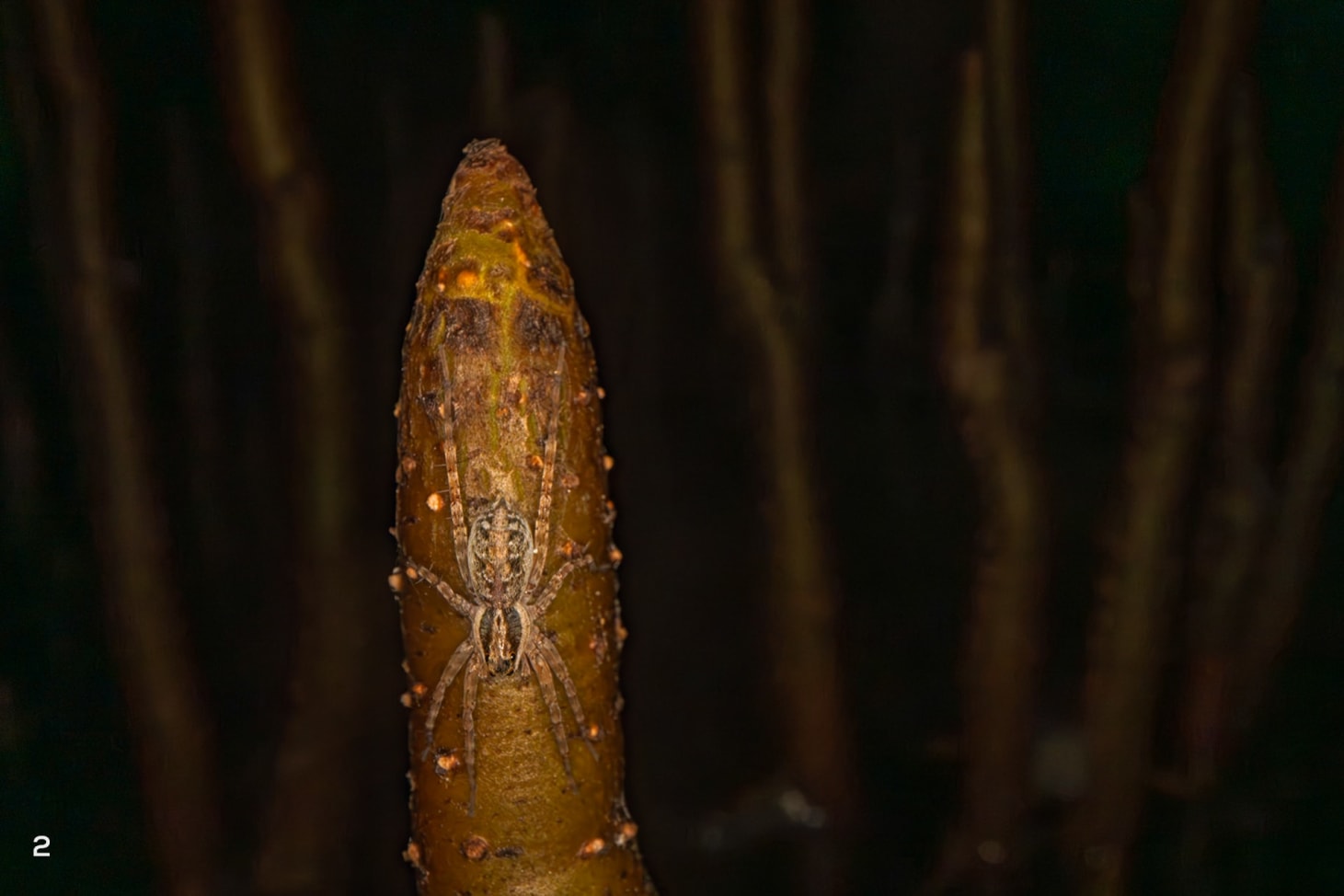 Saltpans surround the shores of Vaippar in every landward direction. As a result, there is very little artificial light on these shores at night. With only the dim light of a headtorch and windy silence, I was forced to hyperfocus on even smaller sections of the tree. Everywhere I shone my light, I saw spiders. Web-building spiders sat on webs that stretched like sails in the wind, while wolf spider eyeshine was scattered generously all over the ground and the surface of the water.