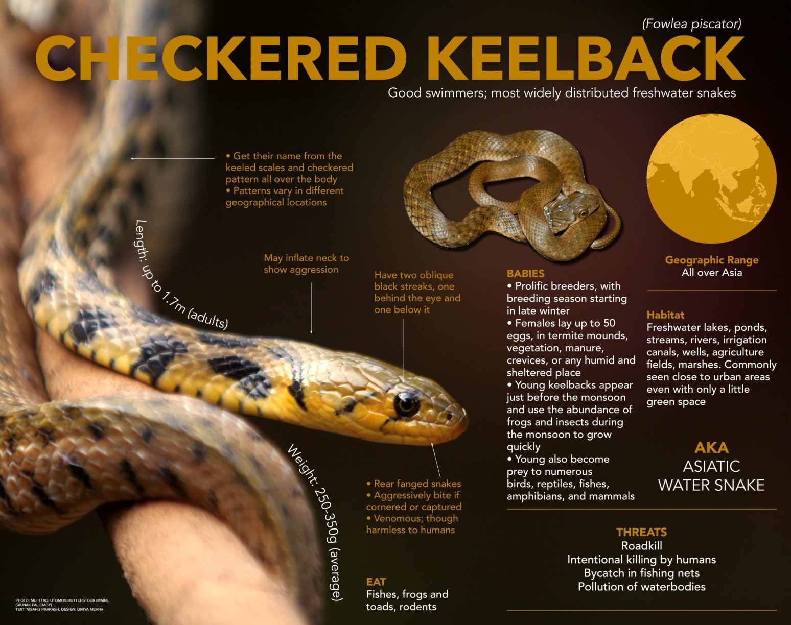 This master of freshwater ponds, lakes, and streams is completely at home in this habitat, using reeds, aquatic plants, and crevices to live its very adaptable life. Found almost throughout mainland India, the checkered keelback has made itself quite at home around humans. In cities, they are found in gardens, living in sewers, back yards and any damp to wet place where they can find shelter and food. In rural settings, checkered keelbacks seem to love rice fields with the bounty of fish and frogs they have to offer. They’re also common in open wells, irrigation tanks, lakes, and ponds. Checkered keelbacks are voracious feeders, responding actively to movement and ripples in water, or any visible movement on land. They strike and grab frogs and fish and will even bite off more than they can “chew”. Read more about these snakes.