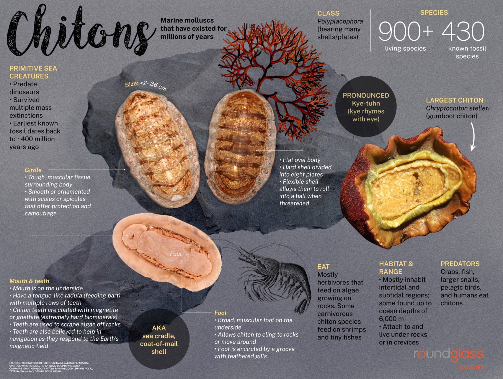 Mostly herbivores that feed on algae growing on rocks. Some carnivorous chiton species feed on shrimps and tiny fishes.