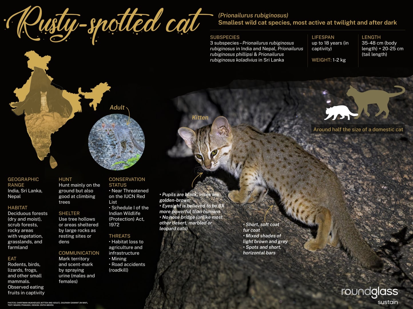 The rusty-spotted cats preferred habitat included deciduous forests (dry and moist), scrub forests, rocky areas with vegetation, grasslands, and farmland. They occur across the large parts of India.