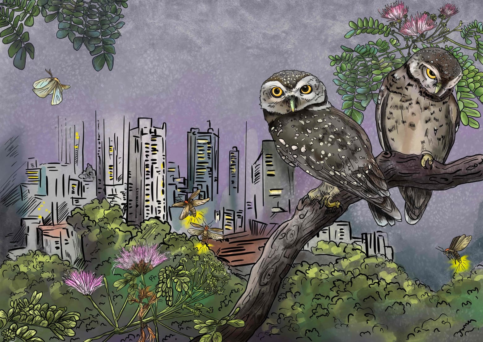A pair of grey hornbills would make a pitstop each evening before heading to their roosts for the night. Paradise flycatchers would transit at teatime, the festive tail feathers of the males dangling like crepe paper streamers. The flying festoon ribbons of their courtship displays would liven up my day. Flameback woodpeckers would circle the tree bark like bejewelled corkscrews, and striking golden orioles gleamed and glinted in the dappled shadowplay of sunshine and shade. Oriental magpie robins, in dapper feather tuxedos, would flit about, making no secret of their presence, sharing their vast repertoire of birdsongs with the ease of professional performers. Tailorbirds would quietly build nests on the rain tree’s branches, while sunbirds bobbed around the pretty-in-pink petals. Coucals and jungle babblers would hop about in the shady undergrowth of the tree. The former were solitary, like a dignified grandpa out on a walk, and the latter in gregarious gangs, living up to their sobriquet, the “seven sisters”. Dusky crag martins would fly near the rarefied upper canopy, whizzing around buildings, roosting in parking lot crevices and ledges, adapting to the makeshift mountains of concrete, having transitioned from the craggy peaks of their ancestors. Once in a while, I would spot a cattle egret or a black-crowned night heron perched ludicrously on a branch, looking like an obvious tourist. On quiet windless nights with nary a breeze, I would stop in my tracks to hear the call of a barn owl, heading to the nearest window to catch a glimpse of a creamy white face shimmering in the moonlight, silhouetted on a branch, near a hollow in the rain tree’s trunk.