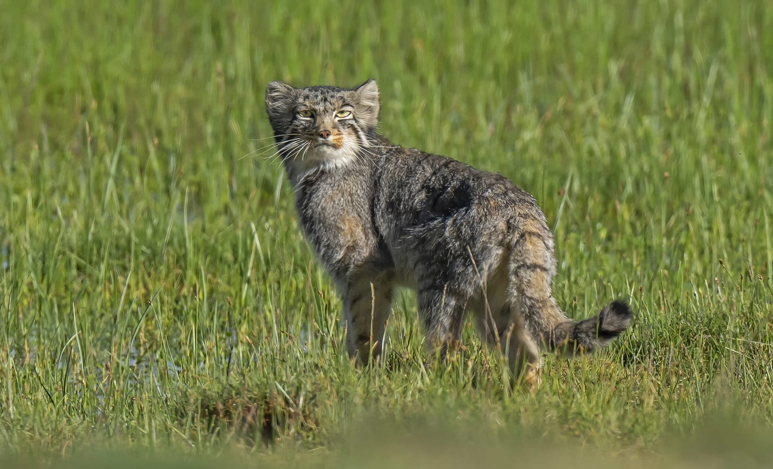 The smallest and arguably the grumpiest looking wild cats in the world — Pallas’s cats (Otocolobus manual) — reside in the Hanle marshes and the surrounding rocky cliff-dominated hills. Locally called ribilik, they live in burrows and rock cavities in steppes and grasslands. Their smoky grey and orange-buff pelts offer them excellent camouflage in the landscape they inhabit. Their short legs enable them to be ambush predators, using short stalks as a predatory strategy rather than running. Broad paws act as snowshoes and help them move around seamlessly during Hanle’s long, snowy winters. During inclement weather, Pallas’s cats wrap their tails around their bodies for additional warmth. While hunting, they use “periscope” behaviour, repeatedly raising their head above the vegetation to check on prey.