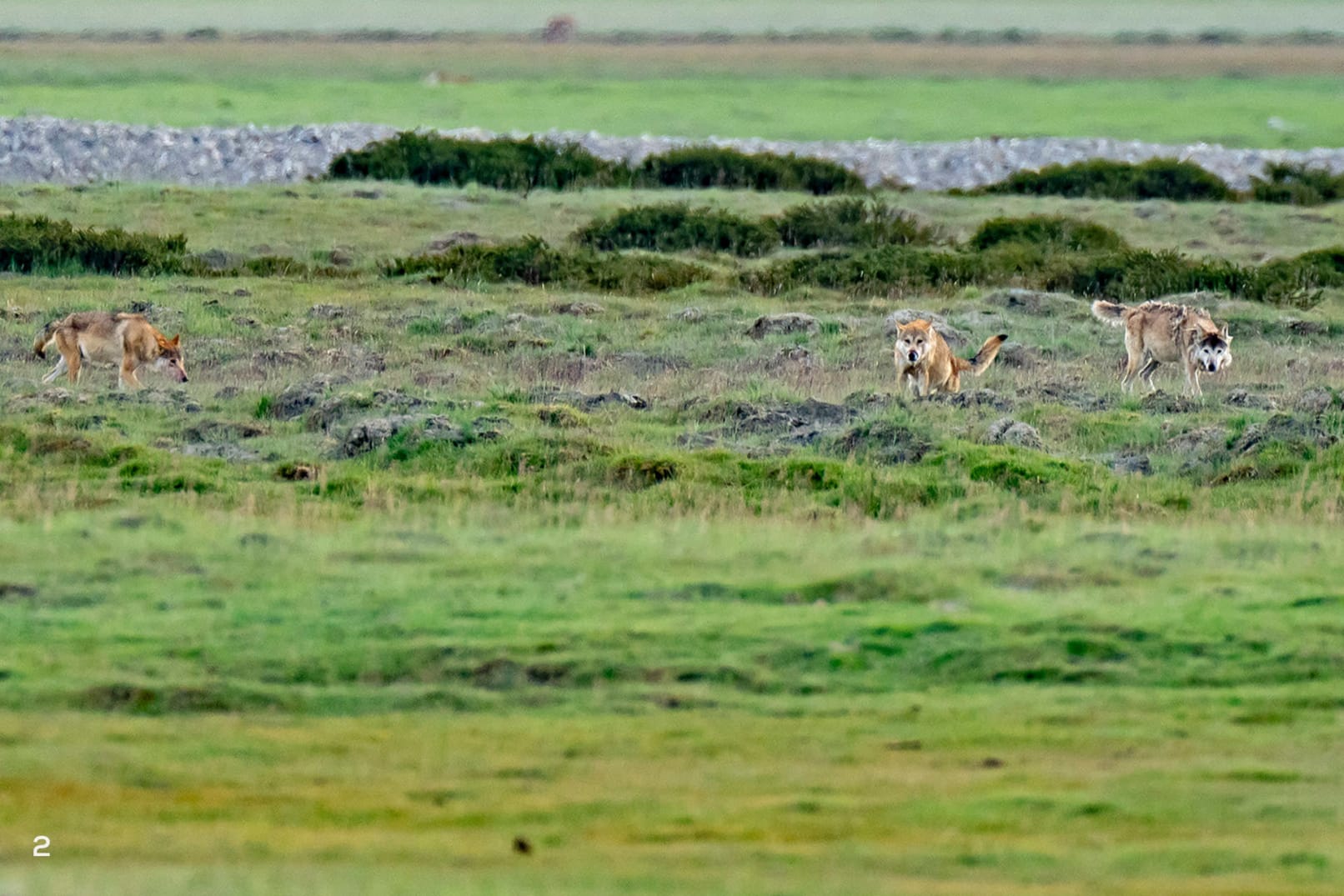 Hanle Valley and its marshes are suitable habitats for wild canids. (1) Red foxes (Vulpes vulpes) are commonly seen in the villages of Hanle Valley, hunting birds, voles, and hares, and occasionally scavenging on livestock carcasses and garbage. (2) Wolves (Canis lupus chanco) can be seen trotting across the desolate landscape either in packs or alone. Wolves prey upon medium-sized wild herbivores like gazelles and young argali and kiang. They are often involved in killing the goats and sheep of Changpa herders, as they are easy domestic prey. Locals traditionally use inverted funnel-shaped wolf-traps (shang-dong) as an indigenous method to manage wolf depredation on their livestock. (3) A very rare wild canid in this region is the Tibetan sand fox (Vulpes ferrilata), a crepuscular (active at twilight) fox that lives in burrows, hollows, and rock crevasses, often close to human habitation. Sand foxes mainly feed on small wild mammals like pikas, voles, and marmots.