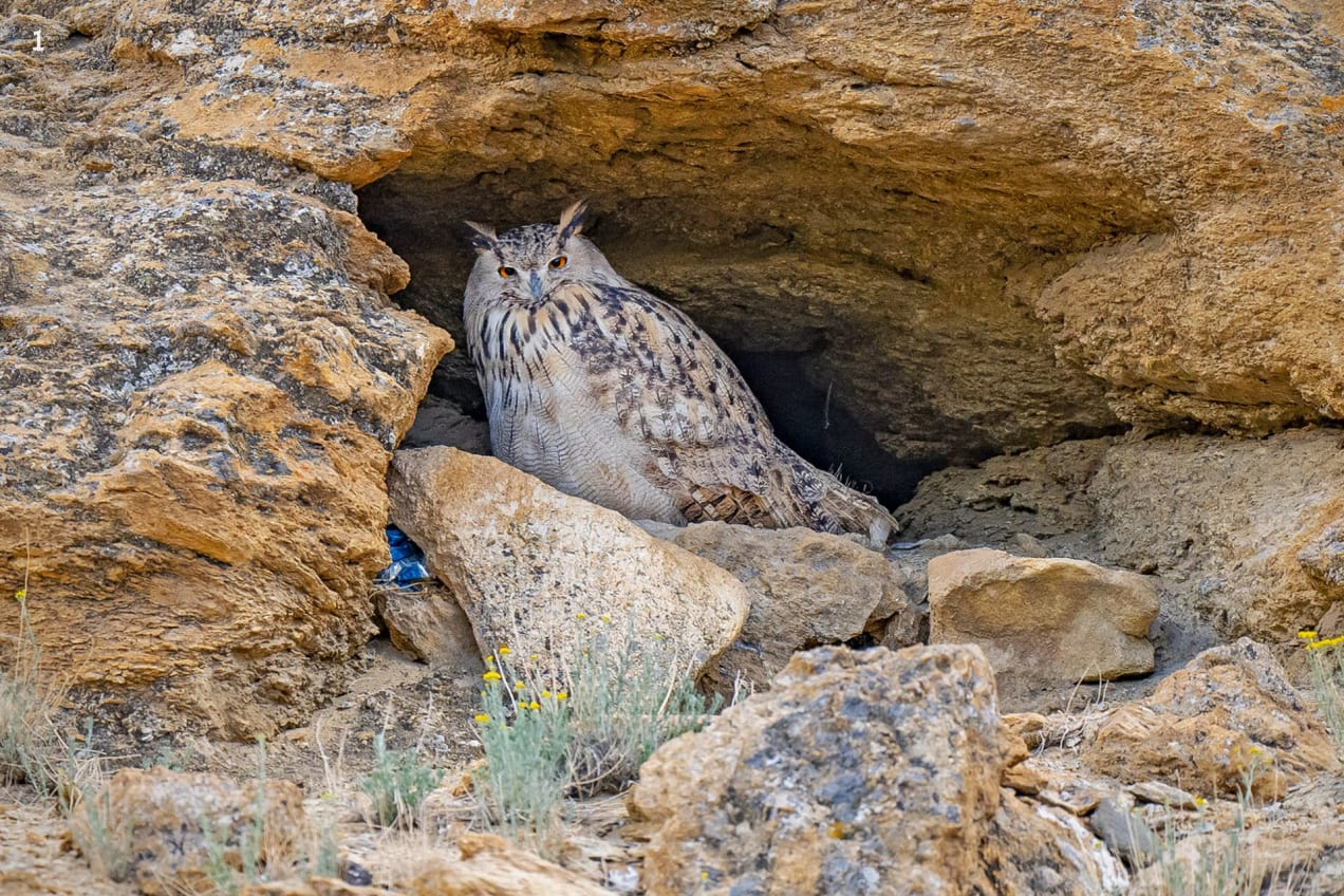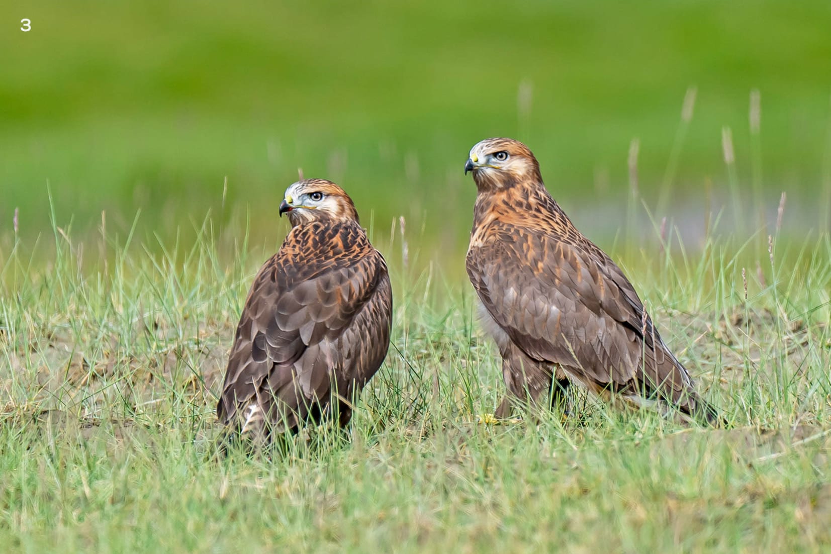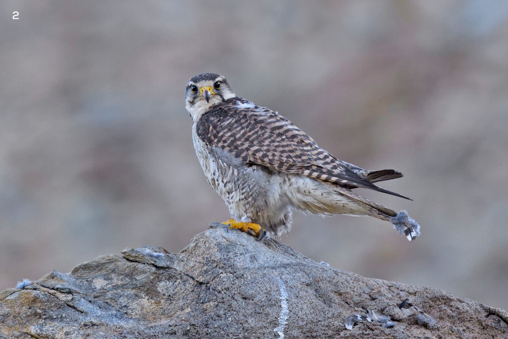 The Hanle marshes and the adjoining arid, steep, rocky, cliff-dominated hills are home to numerous birds of prey. (1) The Eurasian eagle owl (Bubo bubo) is one of the largest owls globally and a top predator. Bright pumpkin orange eyes, feathery ear-tufts and mottled feathers make Eurasian eagle owls visually striking birds. They are very effective hunters owing to their large, powerful feet, shallow wing beats, and fast glide. Eurasian eagle owls may live up to 20 years in the wild. Another predatory bird in the Hanle marshes is the (2) peregrine falcon (Falco peregrinus). The Milkha Singh or Usain Bolt of predatory birds, peregrine falcons have been recorded to clock a diving speed of 390 km per hour. Adults have grey backs and long wings that almost reach the tip of the tail. Peregrine falcons are adaptable and occur in various habitats, including steep cliffs, coastal mudflats, and urban areas. Another raptor found in Hanle is the (3) upland buzzard (Buteo hemilasius), which mostly preys on voles, marmots, and pikas but is known to feed on the eggs of other birds as well.