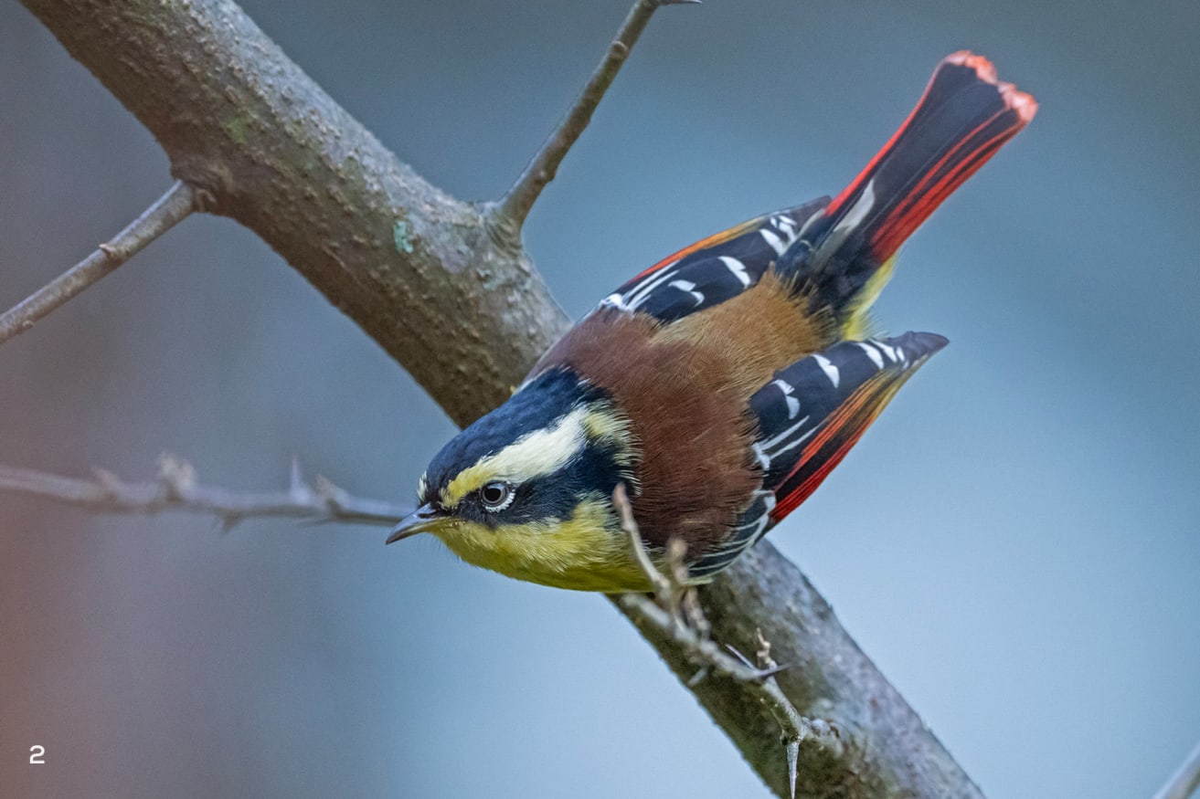 An absolute stunner among the flock is (1) the brightly coloured chestnut-bellied minla (Actinodura strigula) with a rust-coloured mohawk, many shades of yellow, and cryptic patterns scattered across its body. (2) The red-tailed minla (Minla ignotincta) is also an opportunistic feeder like its yellow-feathered cousin and joins mixed-species flocks in their hunting adventures. Both species are skilled acrobats — often seen scaling thin trunks, circling them, and climbing vertical branches with great ease to forage for insects under tree bark.