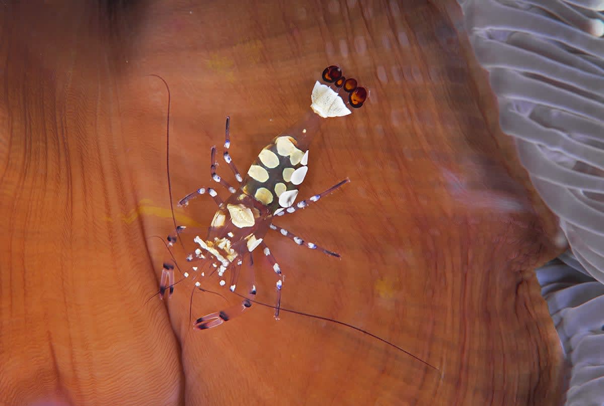 The peacock-tail anemone shrimp (Ancylocaris brevicarpalis), as its name describes, lives in close association with sea anemones. The anemone protects the shrimp from predators, and the shrimp helps keep the anemone clear of debris, parasites, and unwanted slime. The shrimp is unaffected by the anemone’s stinging cells thanks to its hard exoskeleton. Female peacock-tail anemone shrimps are larger in size and have larger and more numerous white spots than males.