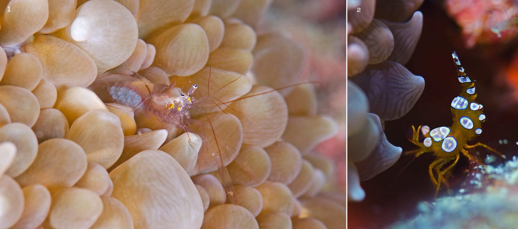 Some shrimp prefer to associate with anemone relatives (cnidarians) like coral. Bubble coral (Physogyra sp.) are hard coral that possess bulbous tentacles that are extended during the daytime giving the coral a bubbly appearance. (1) An unidentified shrimp extends itself out of its bubble coral home to filter feed; developing eggs are clearly visible under its transparent abdomen. (2) Squat shrimp (Thor sp.) are often called sexy shrimp because of their provocative dance. Their quirky abdominal movements, often in sync with one another, are amusing to observe and can captivate divers for long underwater minutes; it’s as if they’re performing in a talent show.