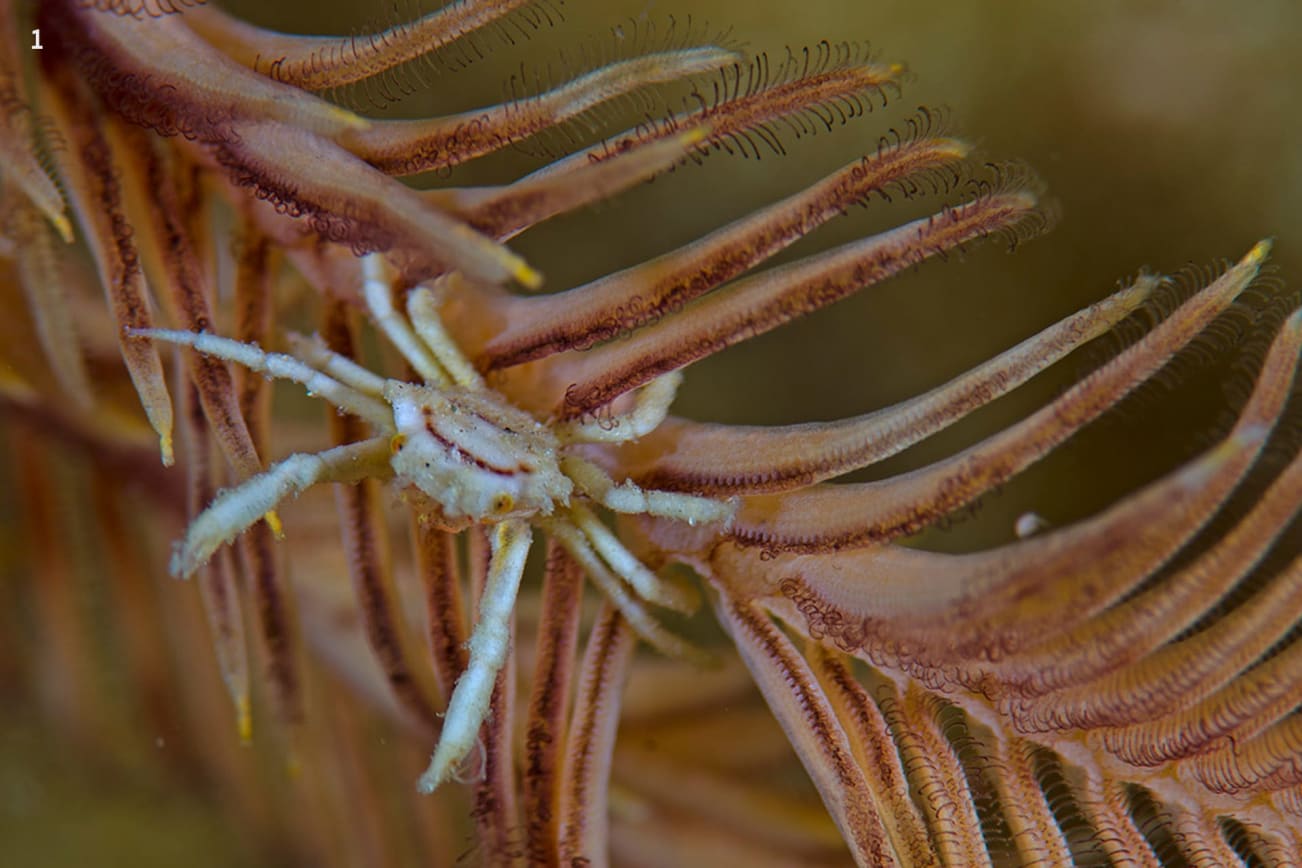 There is no shortage of animals masquerading as plants on the coral reef. Take, for example, feather stars (crinoids), close relatives of sea stars, urchins, and sea cucumbers (echinoderms). Feather stars look like beautiful flowers with many arms with rows of filaments that help trap food particles and a bird claw-like foot to anchor themselves onto the bottom. They offer protection and lack unpleasant secretions or chemical defences. This makes them ideal candidates for commensalism with marine invertebrates like crabs, shrimps, and worms. Crabs (1) and shrimp (2) enjoy prime locations on the feather star’s arms, near the food grove where filtered particles are transported towards the mouth. Feather stars are so conducive to commensalism with small invertebrates that they tend to harbour the highest density of commensals compared to other spikey-skinned animals (echinoderms).