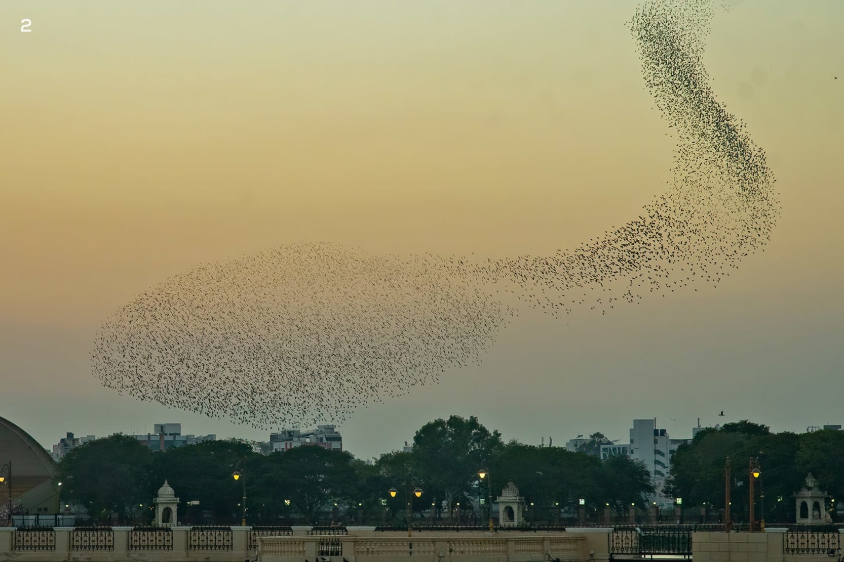 Some of the agile smaller flocks move surprisingly quickly, requiring a great level of synchronisation among individual birds. With more and more birds arriving, such flocks tend to merge and grow larger and larger in size. The blurred outline of the flock flattens and dilates with such great elegance and speed that it seems to belie the concept of individual decision-making and response. Moments like these, viewed in the backdrop of the Lakhota Palace, an 18th-century cultural heritage site in Jamnagar, Gujarat, transport the mind back to times when the masses would have been observing this timeless spectacle with the same fervour as today. Ahmedabad, Junagadh, and Porbandar are other places in Gujarat where large numbers of rosy starlings engage in similar acts. Interestingly, birder Ashvin Trivedi, who has been documenting murmurations for over 15 years in Jamnagar, says, “At Lakhota, rosy starlings have been observed to engage in murmuration even at dawn, just after they wake up and prepare to disperse for the day”.