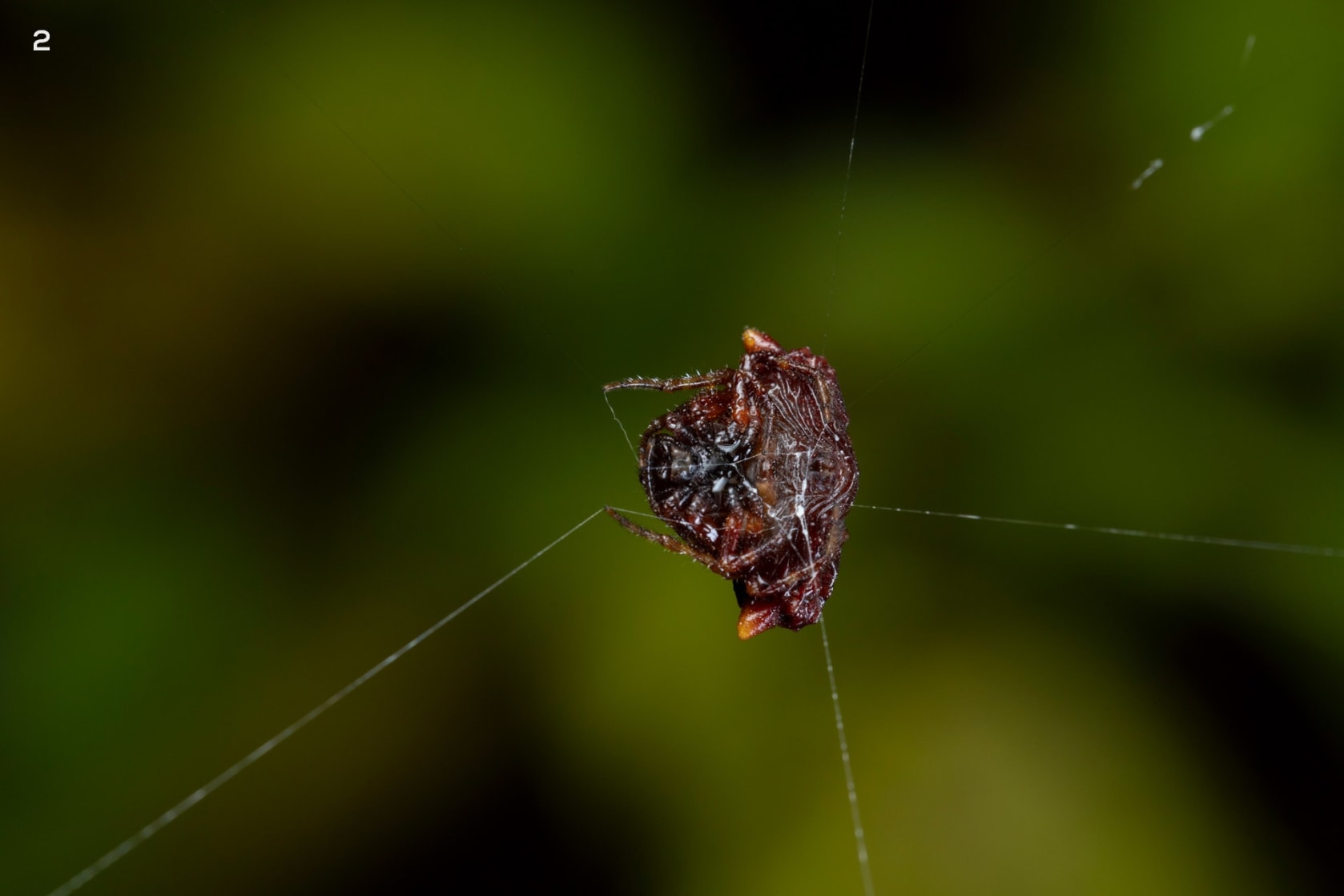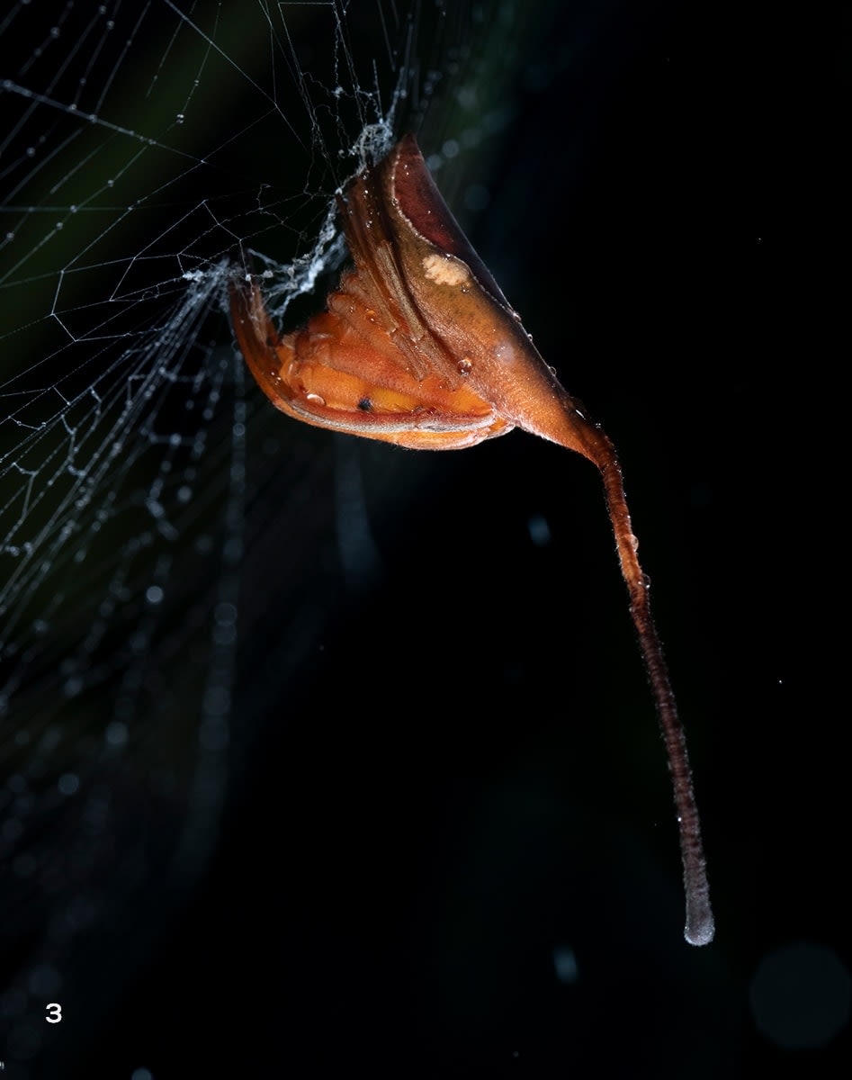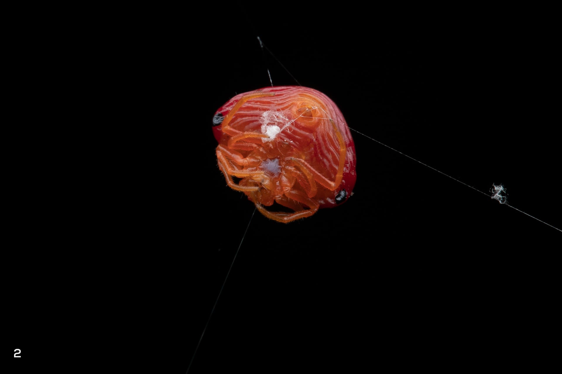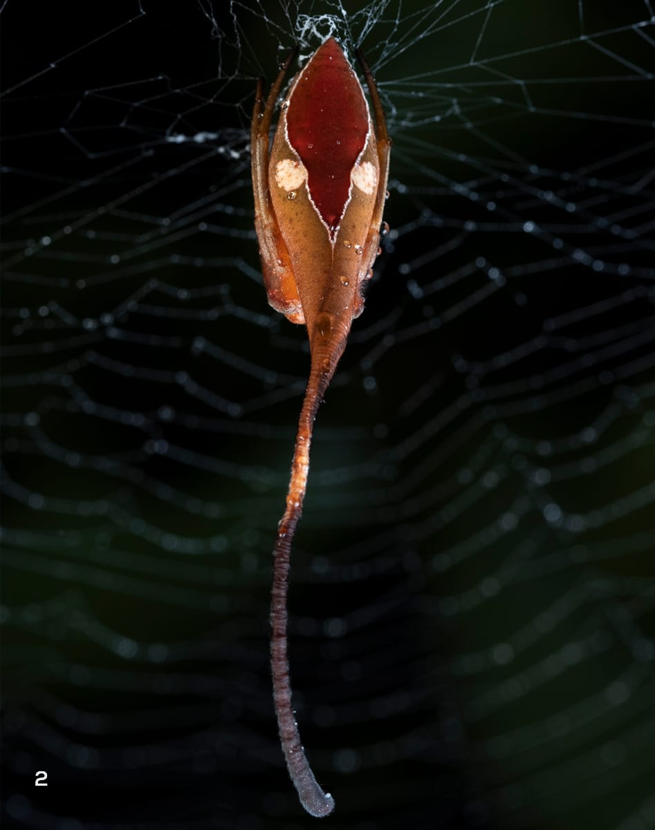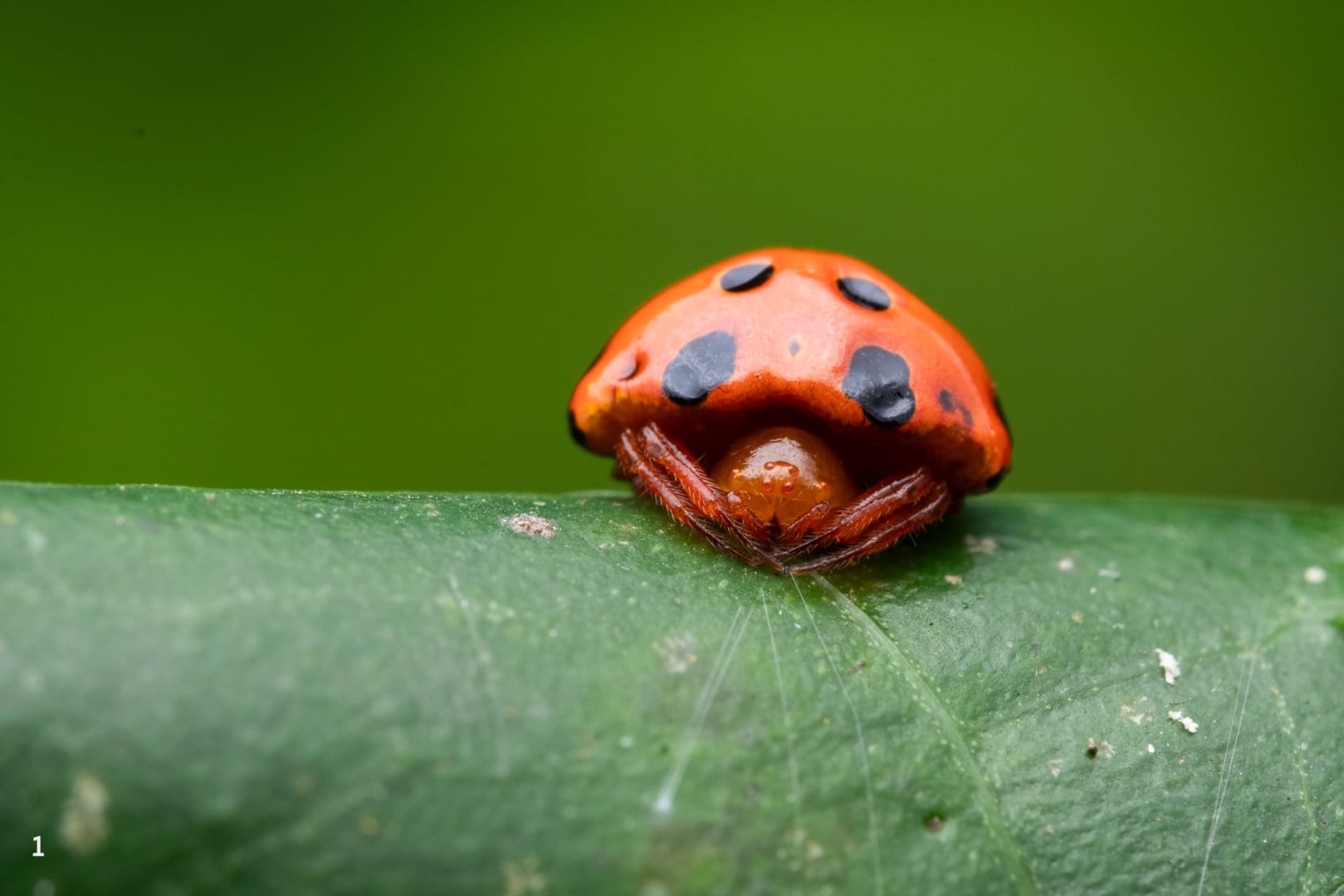 Spiders from the genus Paraplectana are among the most vivid examples of morphological mimicry. They stick out to blend in with the right crowd. Ladybird beetle-mimics like this Paraplectana rajashree have shiny rounded abdomens with black spots to mimic ladybird beetles from the genus Coccinella. Even when these orb-weaving spiders (2) move along a line of silk or (3) sit on their orb-webs, they maintain a cryptic ladybird-beetle-like pose with their legs tucked in.