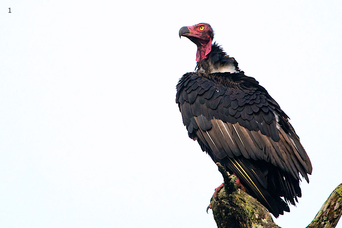 Commonly known as the king vulture and locally called raj giddh in central and northern India, these birds are found over much of the Indian subcontinent (except the central-south, eastern and southeastern parts of the peninsula). A bare red head atop a dark, grey-black medium-sized body makes this bird stand out from other vulture species. Adults (1) and juveniles (2) may look slightly different. Males have yellowish eyes, and the females’ eyes are reddish-brown. Red-headed vultures are generally seen alone or in pairs and are shy and solitary compared to other subcontinental vultures. They are also solitary nesters, nesting on tall trees in inaccessible locations. Their strong bills are adapted to tear open tough hides. A dedicated conservation breeding centre for red-headed vultures is coming up at Gorakhpur, Uttar Pradesh. Photos: Shreeram MV