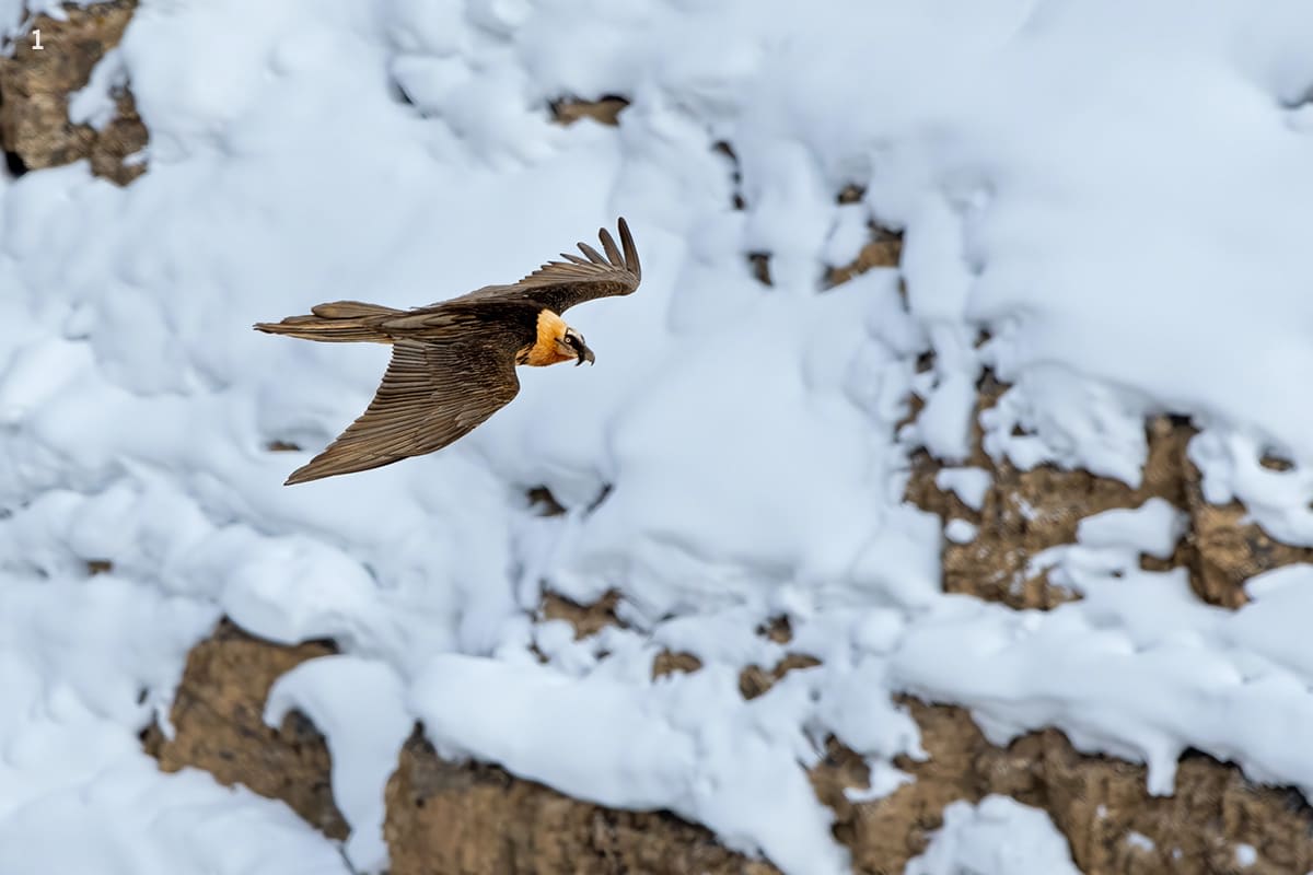 Bearded vultures are called kyaklak in Spiti and skyaklak in Ladakh. These Himalayan residents migrate to the Himalayan foothills in winter. They have a tuft of feathers at the base of the bill for which they are named. During flight, their wide wingspan and elongated diamond-shaped tail feature prominently. Bearded vultures carry the bones of large herbivores to a height and drop them on rocks to split them so they can feed on the marrow. They build large nests on cliffs and caves. Photos: Soumabrata Moulick (1), Dhritiman Mukherjee (2)
