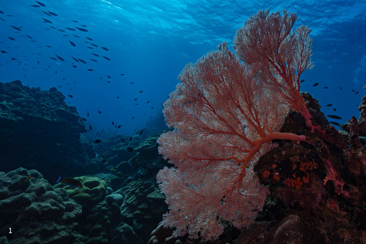 (1) Gorgonians or sea fan corals, a type of soft coral, are particularly visible around Tarmugli, Grub, and Red Skin islands in MGMNP. These “soft corals” are unlike hard corals, which have skeletons made of calcium, and instead have a flexible skeleton made of proteins. They are often found swaying, oriented perpendicular to the currents to ensure efficient capture of plankton through filter-feeding. (2) The orange and red coloured cup corals are Tubastraea, a genus of heterotrophic coral that does not contain any zooxanthellae algae. They can be observed growing underneath ledges and in deeper waters where there is less competition due to little or no sunlight. They are nocturnal and use their tentacles to capture zooplankton.