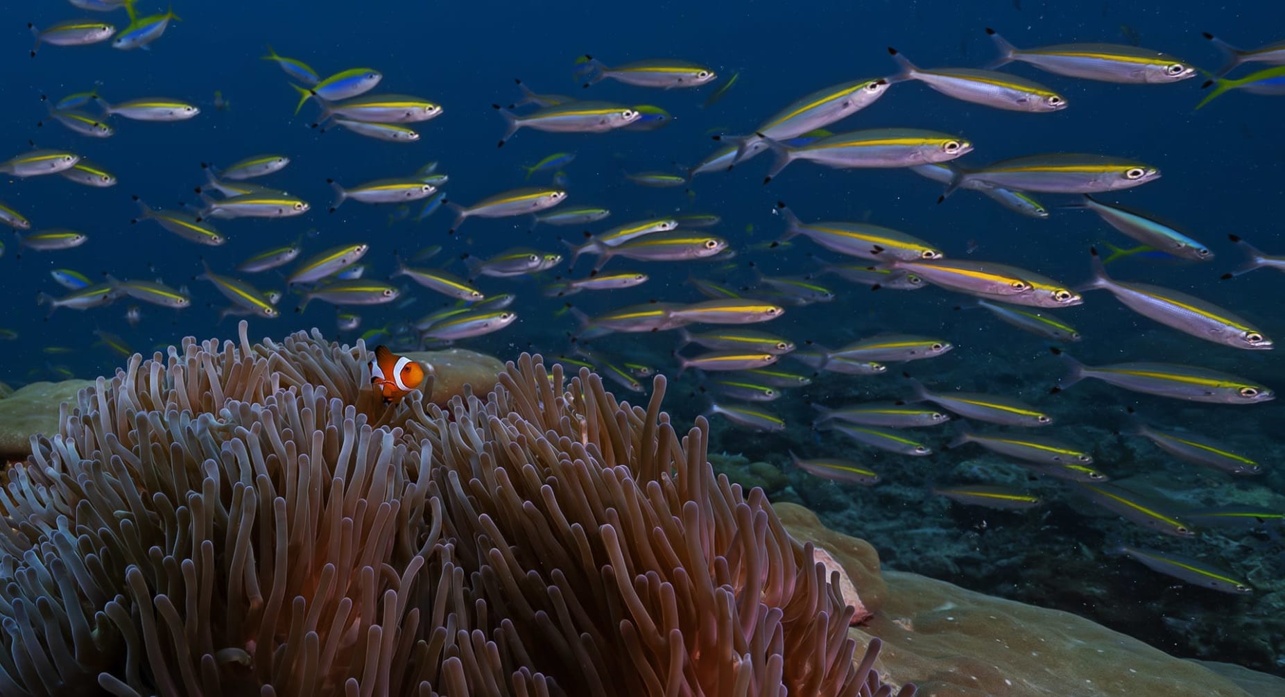 Diving in MGMNP, you may catch Marlin and Coral of the Disney movie Finding Nemo; they are the famous orange-coloured (1) ocellaris clownfish (Amphiprion ocellaris) often nestled in their protective anemones. You will also likely encounter schools of fusilier fish (sometimes visible even from the boat) such as the goldband or yellowband fusilier (Pterocaesio chrysozona) with a prominent yellow stripe along its side, and yellowback fusiliers (Caesio xanthonota) which have yellow backs and predominantly blue bodies.