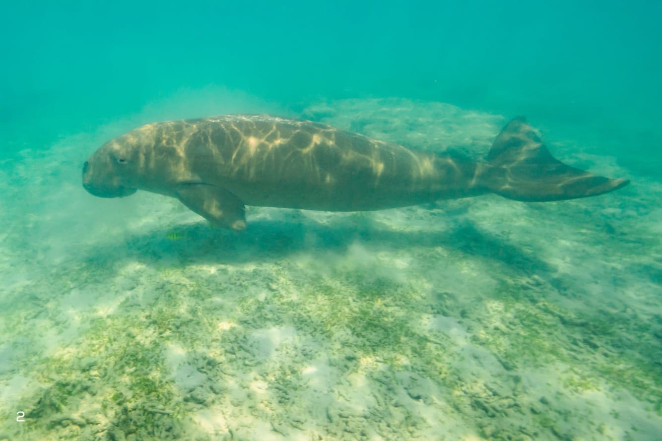 (1) Trevallies such as the bigeye trevally (Caranx sexfasciatus) or bluefin trevally (Caranx melampygus) are common around MGMNP. (2) Schools of blackfin barracudas (Sphyraena qenie) lurk in the water column, sometimes in large schools. (3) Painted sweetlips (Diagramma pictum) and large spot sweetlips (Plectorhinchus macrospilus) are often found resting below ledges or reefs along with groupers, such as this whitespotted grouper (Epinephelus coeruleopunctatus) on the right, that could easily be missed at first glance.