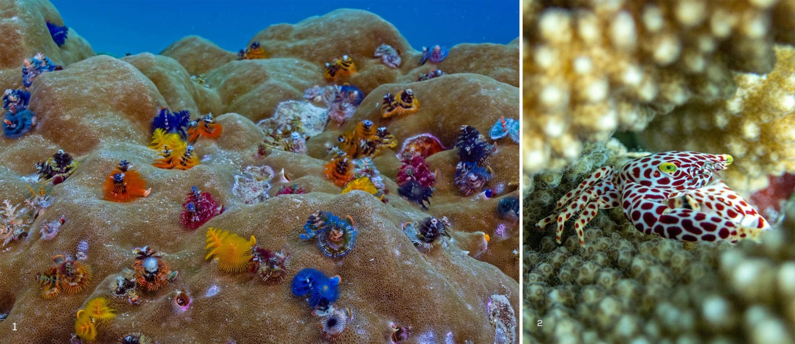 Within hard corals like Porites and branching Acropora, you can spot many small critters like Christmas tree worms (Spirobranchus giganteus) and rust-spotted guard crabs (Trapezia rufopunctata). (1) Christmas tree worms are tube-building polychaete worms that permanently live within a tube bored into live corals. Feather-like tentacles cover their appendages, which protrude from their bodies and resemble tiny Christmas trees. The worm uses these tentacles to draw oxygen from the water and trap prey. (2) The rust-spotted guard crab has a unique pattern that likely helps it camouflage within colourful corals.