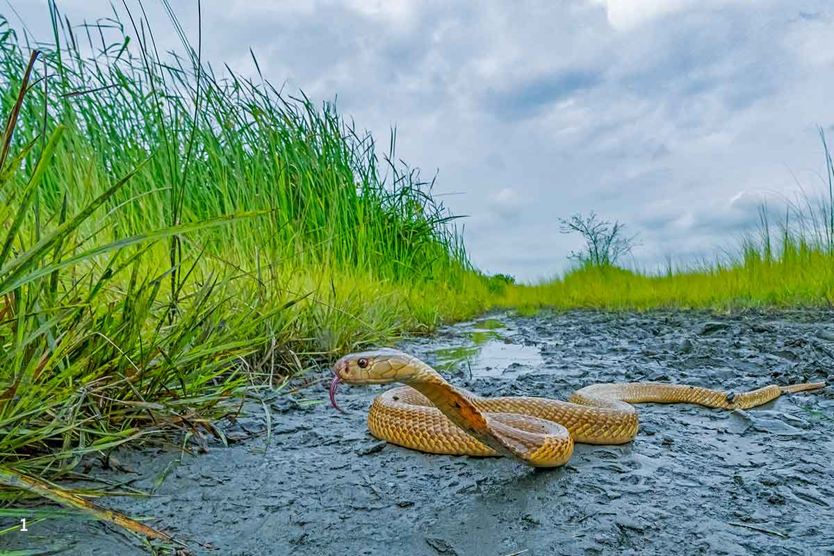 Dankuni supports mammals like the fishing cat (Prionailurus viverrinus), the state animal of West Bengal. Reptiles like the monocled cobra (Naja kaouthia) (1) and the Indian flapshell turtle (Lissemys punctata) (2) share these spaces.