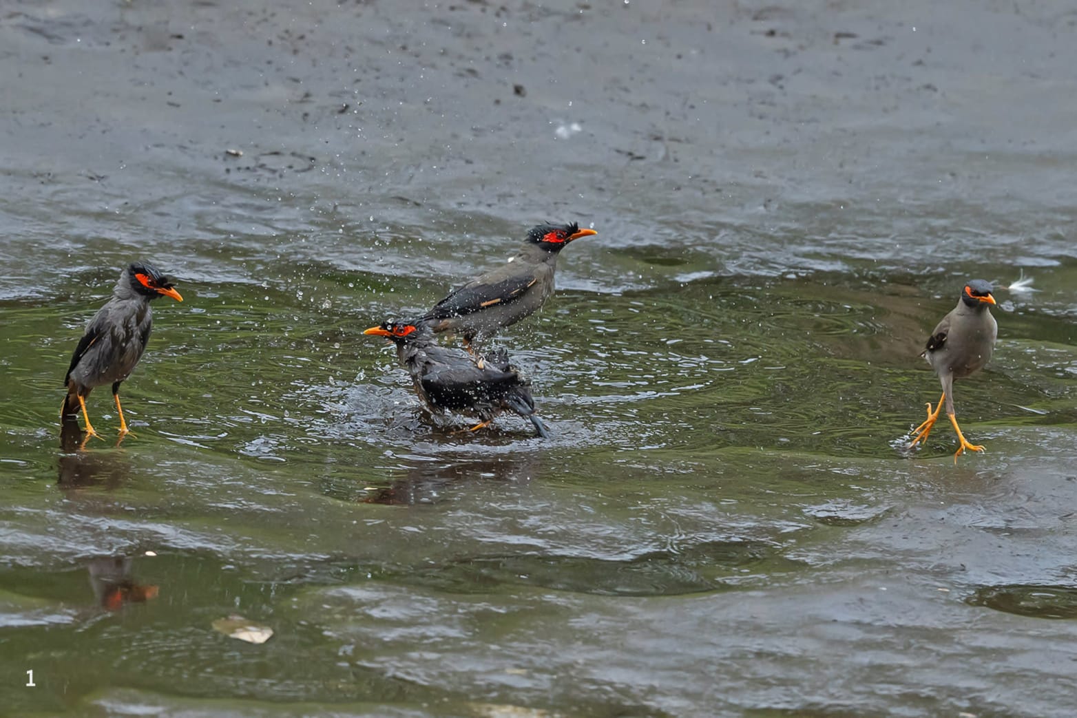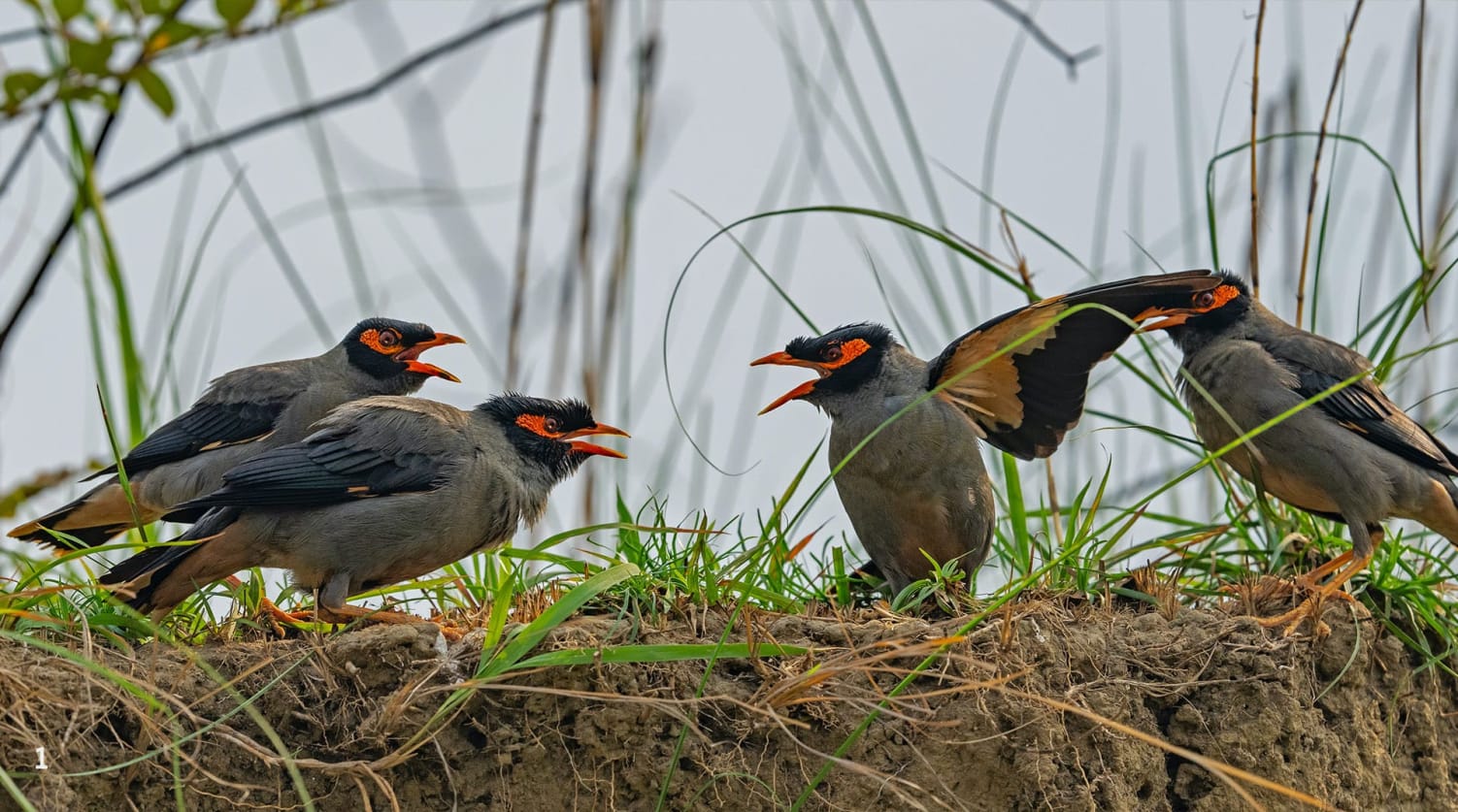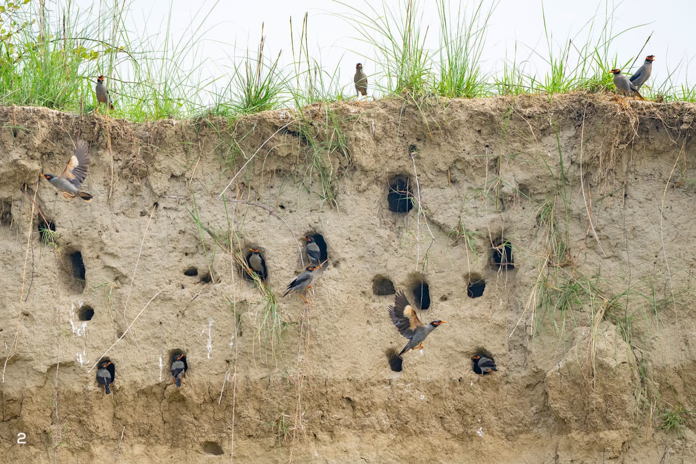 The bank myna, as its name indicates, frequently nests on the banks of large rivers, excavating holes in the soft mud. The nest is a crude mixture of sticks, feathers, and even plastic pieces, where they lay 3-5 eggs. The fledged chicks follow the parents, perpetually hungry and begging for food. The breeding happens from late April to August, with two broods sometimes raised in a season.