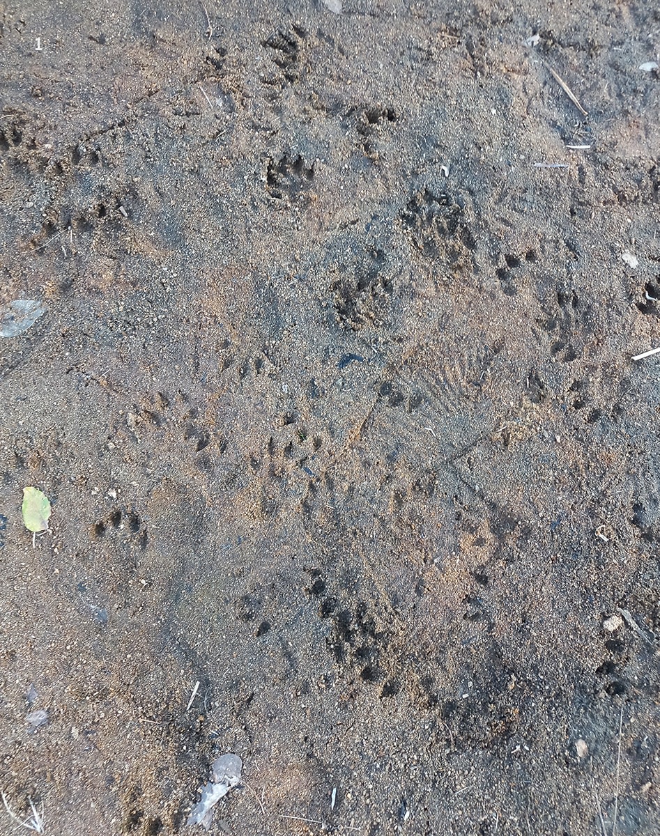 With no physical evidence of our own, however, the situation seemed rather bleak until we stumbled upon crystal clear tracks near the village of Aladiyur. A flurry of fresh prints with five digits (toe prints), signs of webbing between the toes, and an elongated central pad marked a long stretch of damp riverside mud. The river here flows deep and slow, banked by swathes of sand and thick vegetation — an ideal space for them to carry out their daily routine in secrecy. While footage of the secretive neer naai continues to elude the team, such conclusive signs drive them to continue the search. They scout different sections of the river for suitable otter habitats and sit up late into the night on the riverbank, hoping for a glimpse and, perhaps, an incriminating photograph.