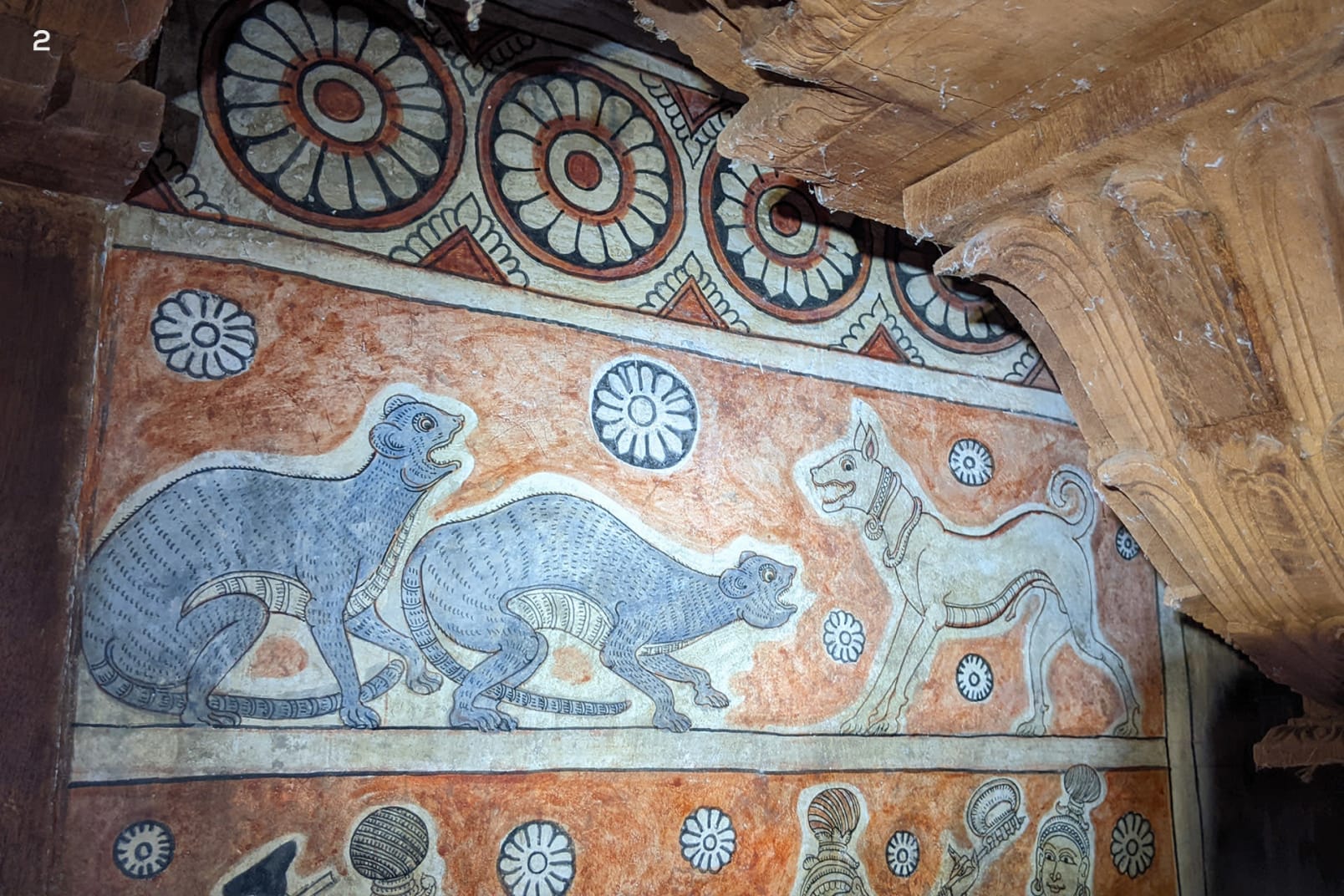 (1) The Tamiraparani River starts in the Western Ghats. Its river basin, which spans roughly 5,700 sq km, is the lifeline for people and other life forms in Tamil Nadu’s Tirunelveli and Thoothukudi districts. (2) The conflict between otters and free-ranging dogs, depicted in this centuries-old painting in a 1,200-year-old temple in Thiruppudaimaruthur, continues to be one of the major threats to otters in India today. Photos: Smriti Mahesh (1), Thanigaivel A. from ACCC (2)