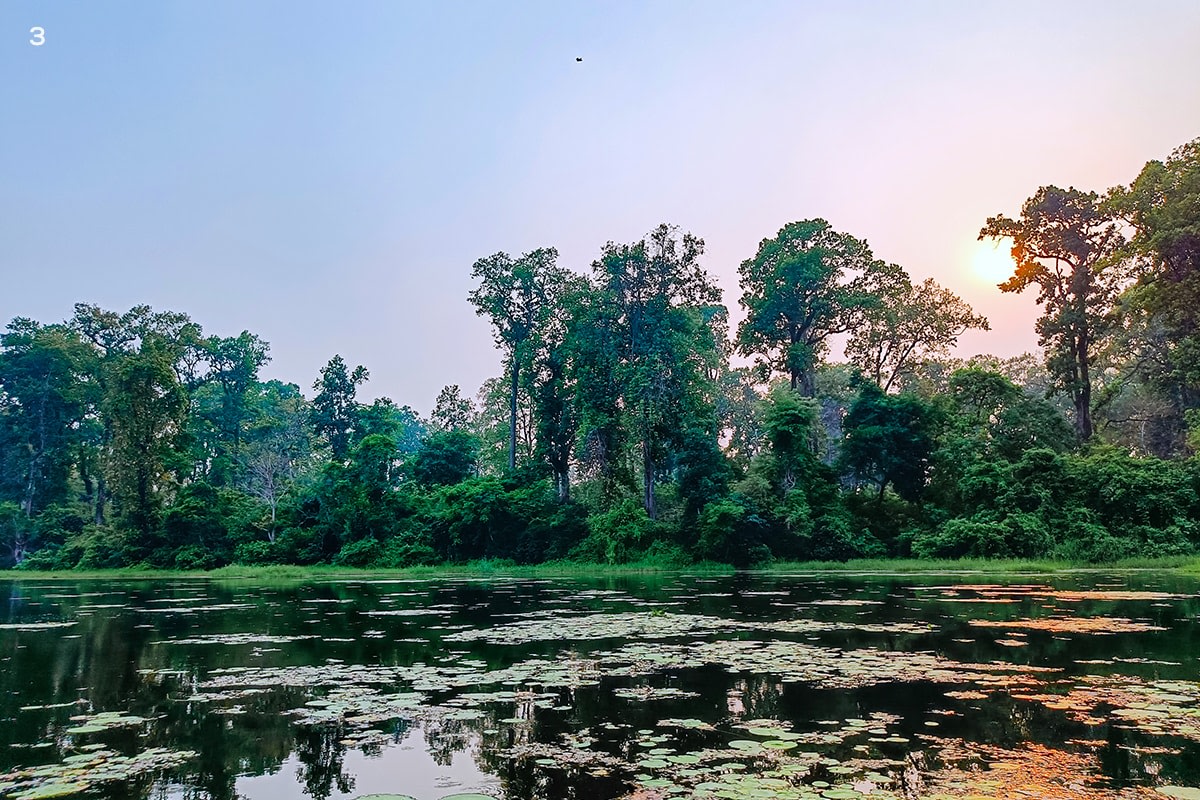 We decided to explore the reservoir the following day to see more birds, while secretly hoping to glimpse an elephant or two stopping by for a drink from the surrounding Baikunthapur forests. A pair of eye-catching pheasant-tailed jacanas, hidden amongst floating vegetation, lit up our morning. Their cousin, a bronze-winged jacana, foraged nearby. Jacanas are also known as lily-trotters or lotus birds for their ability to walk on floating vegetation with their long, spidery feet.