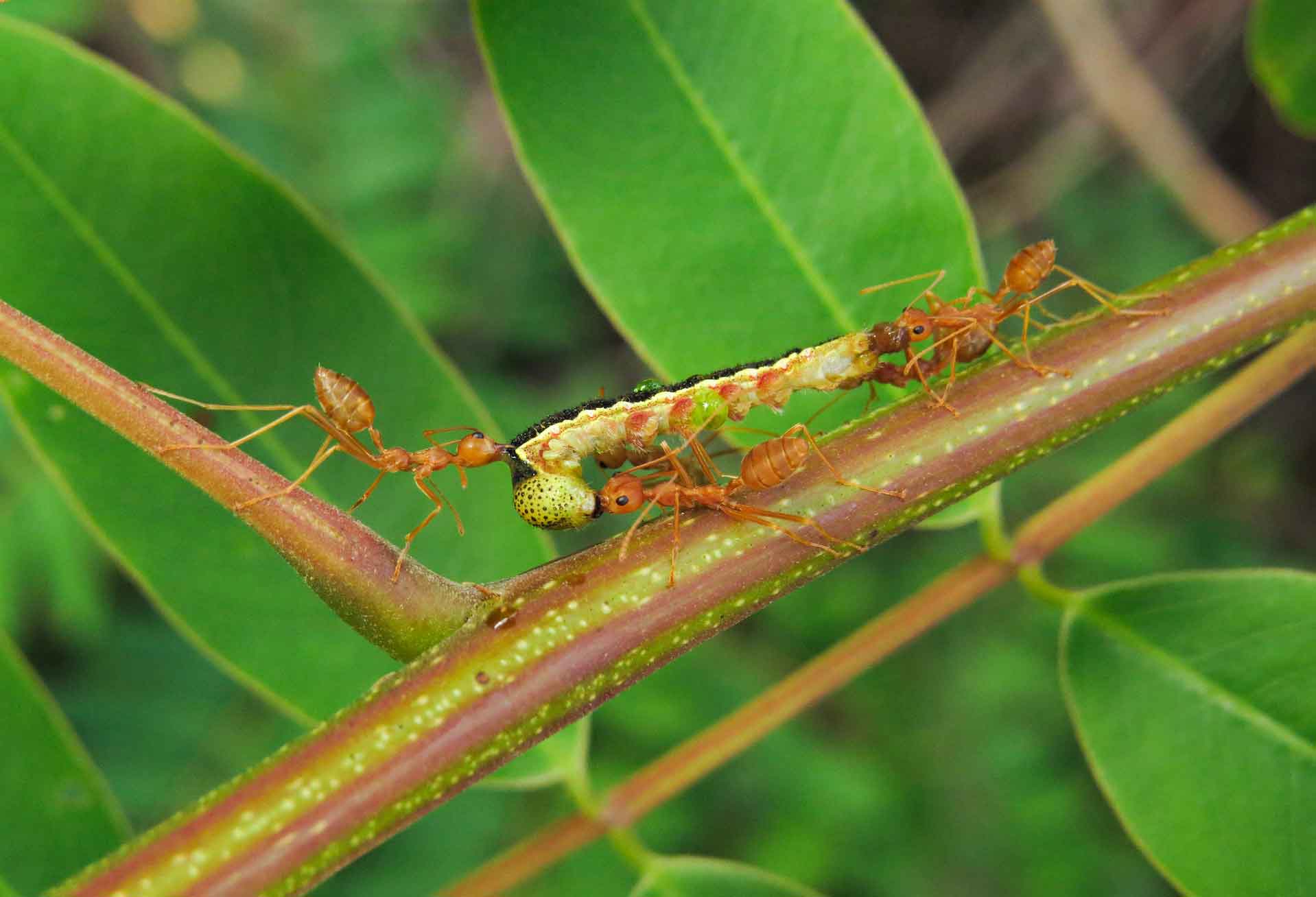 While the tree was buzzing with activity, things were not quite the same on a bush of the same species across the road. This bush was well laden with emigrant eggs. However, there was one crucial difference. Weaver ants (Oecophylla) populated it. The ants had a nest on an adjacent mango tree and had spread their sentries wide. A few days after the caterpillars had hatched, the ants took notice of the plentiful food source and began their march through the bush. As I watched them in action, I could see how they earned their name as an army. They systematically moved through each twig and under each leaf, searching for grubs. The caterpillars were green and well camouflaged along the green midrib of the leaves, but this only delayed the inevitable. Once found, they stood no chance. The sentry that discovered a caterpillar would clamp down with its jaws, fastening prey three times its size in place with unimaginable strength. Pheromones would signal a call to the infantry. Tens of ants would rush the prey, jaws tearing it apart as it still resisted, while amber-orange abdomens curled, showering it with formic acid. The caterpillar could only struggle in vain as the army — half focused on disembowelling it — fully focused on dragging it to their nest.
