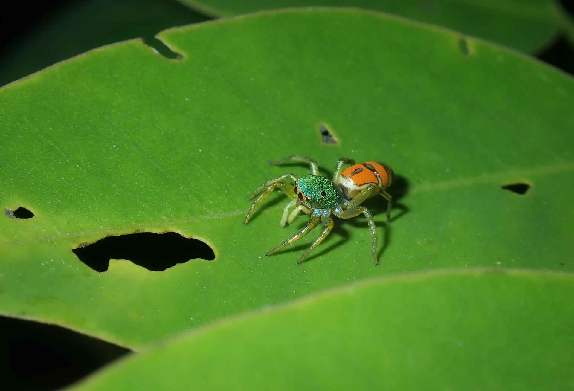 Arthropods made up another set of hungry customers, making the most of the easy meal. Spectacularly beautiful jumping spiders like an orange-backed Chrysilla sps. (among several others) prowled the branches, looking for anything that moved. Predatory stink bugs scanned the leaves, injecting their proboscis and sucking the caterpillars dry, like oversized juice boxes. Parasitoid wasps and flies snooped around, searching for the ideal green incubation sack in which to lay their eggs.