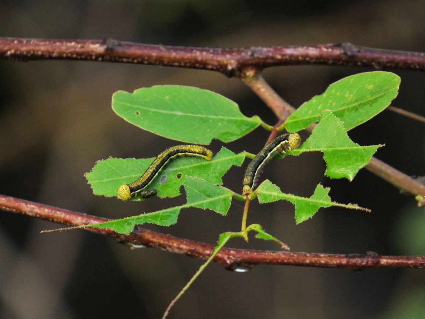 Within a few days, caterpillars began to emerge. They were barely 3-4 mm long but their appetites were completely disproportionate to their size. Within just a day after hatching, most of the tree’s leaves were peppered with neat, circular holes. The tiny greenish-yellow grub grew at seemingly unequal rates, populating the tree with all possible instars (life stages). But regardless of size, food seemed to be the only thing on their minds. By the end of three days, they had eaten so much that the ends of the twigs were skeletal remains of the once lush green vegetation.